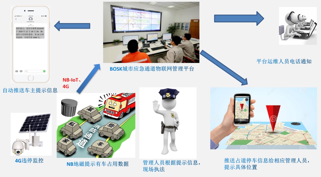 係統(tǒng)應用(yòng)流程:建立城市應急通道違停預警管理係統雲平台,在城市各轄區(qū)消防通道路麵安裝NB-IoT地磁車檢器及4G監控設備,進行車輛數據(jù)采集和監測,各區域管理人員使用PDA或手機安裝違停(tíng)智能預警管理係統APP,時時接收監測信(xìn)息(xī);當有違(wéi)停車輛停放在消防通道時,地(dì)磁檢測器檢測(cè)到有車輛停放信息,實時(shí)自動推送信息到城市(shì)運(yùn)管中心的應急通道預警(jǐng)管理係統平台,並(bìng)自動通過短信提示車主及時(shí)離開否則違(wéi)停罰款,如在規定的時間內車輛沒有離開違停區域,平台會再次(cì)自動推(tuī)送信息到對應的區域管理人(rén)員PDA或手機,預警信息包含車輛停放位置、停放(fàng)時(shí)間、停放數量等,管理人員通過違(wéi)停車輛的電子地圖位置,可以(yǐ)及(jí)時趕到現場進行處罰,快速消除隱患、防患未然,確保轄區居民消防通道暢通。