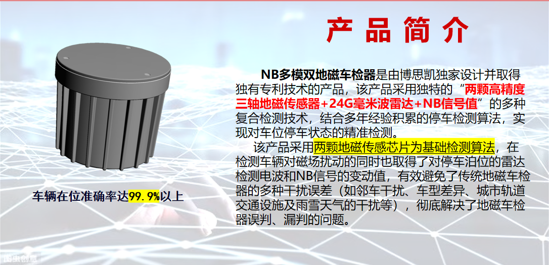 NB-200D多模雙地磁車檢(jiǎn)器是專為(wéi)路邊停(tíng)車、智能車庫設計的(de)停車檢(jiǎn)測裝置,在雙地磁傳感(gǎn)器融合算法的基礎上增加了毫米波雷達及NB信(xìn)號值檢測裝置,突破了雙地磁傳(chuán)感器在幹擾和靈敏度上的限(xiàn)製,使得檢測準確率提高到99.9%%%u4E0A。